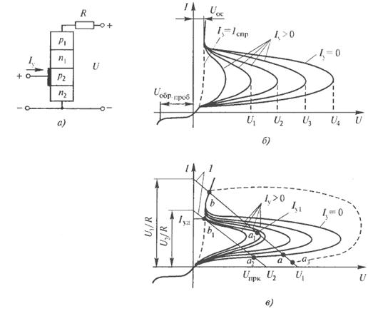 а – структура; б – вольт-амперная характеристика; в – характеристики, поясняющие процесс включения; 1 – линия нагрузки