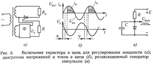 Изменяя ток, можно менять напряжение, при котором происходит переключение тринистора, и тем самым управлять моментом его включения. Семейство вольт-амперных характеристик тринистора показано на рисунке 4, б. Процесс включения и выключения тиристора поясняет рисунок 4, в.