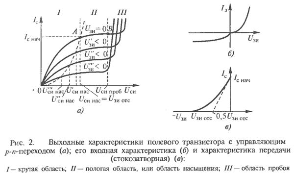 В усилительных каскадах транзистор работает на пологом участке характеристики. За точкой. В возникает пробой транзистора. Входная характеристика полевого транзистора с управляющим p-n-переходом представляет собой обратную ветвь вольтамперной характеристики p-n-перехода. Хотя ток затвора изменяется при изменении напряжения UCИ и достигает максимума при коротком замыкании выводов истока и стока (ток утечки затвора IЗ ут) им можно пренебречь. Изменение напряжения UЗИ не вызывает существенных изменений тока затвора, что характерно для обратного тока p-n-перехода.