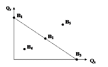 Двигаясь вдоль бюджетной линии, от набора В1 и В3 к В2, потребитель переходит к точке В2, тем самым увеличивая полезность. Точка где бюджетная линия совпадает с касательной (В2), к наивысшей из доступных кривых безразличия называется точкой потребительского оптимума где предельная нормадвух благ, равна обратному отношению цен этих благ. My / Mx = Px / Py
