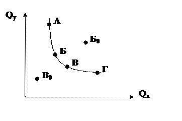 Анализ: точки на кривой А, Б, В, Г дают потребителю одинаковое общее удовлетворение. Комбинации благ, представляющие для потребителя большую или меньшую полезность, будут находиться либо выше, либо ниже кривой безразличия. Набор кривых безразличия для одного потребителя и одной пары благ образуют карту безразличия.