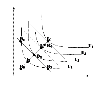 В этой точке наклон бюджетной линии равен наклону кривой безразличия. Увеличение дохода при неизменных фиксированных ценах двигают бюджетную линию вверх и вправо и наоборот.