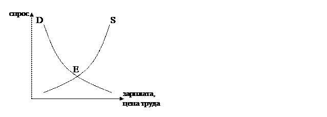 Кривая спроса D показывает, каким будет спрос на труд при определённой величине з/п, а кривая S – общее количество рабочего времени, которое согласно отработать какая – либо категория работников при данной величине заработной платы.