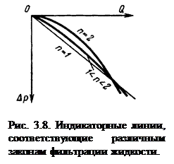 Массовый расход для жидкости (формула 2 строка 1 колонка) пропорционален депрессии в степени 1/n, поэтому индикаторная линия Q =f(Δp) при 1 < n < 2 будет иметь вид выпуклой к оси дебитов степенной кривой с дробным показателем меньшем 2. В случае фильтрации по закону Краснопольского, как показывает формула (5 строка 1 колонка), индикаторная линия является параболой второго порядка. На рис. 3.8 приведены индикаторные линии для течения несжимаемой жидкости при линейном законе фильтрации (n = 1) и при нелинейных законах: 1 < n < 2 и n = 2. Все сказанное относится также к индикаторным линиям для газа, если строить их в координатах Qm (или QАТ) и