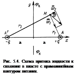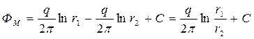 Рассмотрим в бесконечном пласте совместную работу двух скважин: скважины стока А с дебитом q и скважины – источника А¢ с дебитом q. Потенциал в любой точке М, находящейся на расстоянии r1 от скважины А и r2 от скважины А¢: