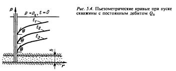 Пьезометрические кривые представляют собой логарифмические линии (рис. 5.4). Давление на забое скважины падает с течением времени, углы наклона касательных Θ на забое одинаковы для всех кривых.
