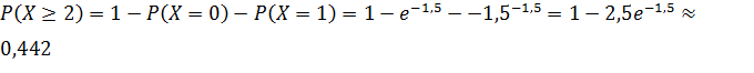 Число вызовов Х, поступающих на АТС за 1 минуту имеет пуассоновское распределение. Среднее число вызовов, поступающих за 1 минуту равно 1,5. Найти вероятность того, что за 1 минуту поступит не менее двух вызовов.