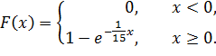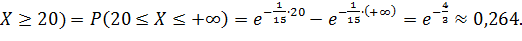 Установлено, что время ремонта телевизоров есть случайная величина, распределённая по показательному закону. Определить вероятность того, что на ремонт телевизора потребуется не менее 20 дней, если среднее время ремонта телевизоров составляет 15 дней. Найти плотность вероятности, функцию распределения, среднее квадратическое отклонение.