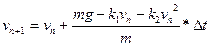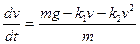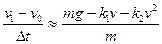 Рассмотрим свободное падение с учетом сопротивления среды. Математическая модель движения - это уравнение второго закона Ньютона с учетом двух сил, действующих на тело – силы тяжести и силы сопротивления среды. Движение является одномерным; проецируя векторное уравнение на ось, направленную вертикально вниз, получаем: