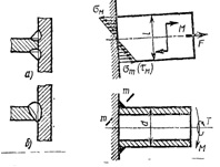 Сварных соединений в тавр(тавровые), нагруженные изгибающим моментом, рассчитывают как консольные, но с учетом особенностей сварки. В случае приварки балки без скоса кромок, сварные швы, как и все угловые, рассчитывают по касательным напряжениям. Расчетный момент сопротивления выражается через параметры опасных сечений сварных швов: