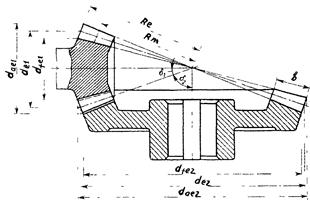 Размеры по внешнему торцу внешнему дополнительному конусу) колеса удобнее для измерения, их указывают на чертежах, а параметры, по которым ведуться расчеты в данном сечении являются стандартными.