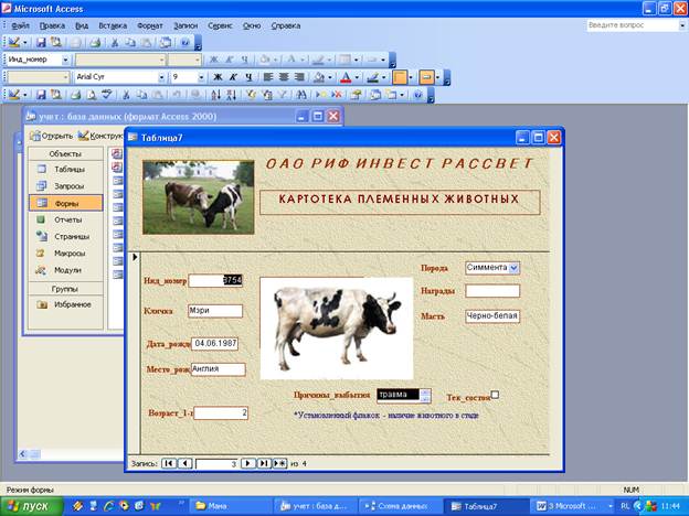 Формы используются для ввода и редактирования записей в таблицах базы данных. Подобно таблицам и запросам, их можно отображать в трех режимах: в режим формы, предназначенном для ввода данных, в режиме таблицы, где данные представлены в табличном формате, и в режиме Конструктора, позволяющем изменить внешний вид, содержание и функционирование формы.
