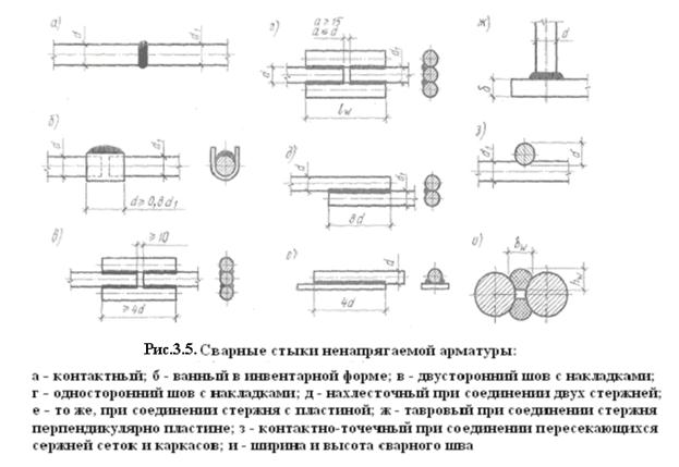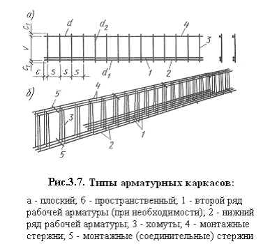 Сварные плоские сетки изготавливают шириной до 3800мм с продольной и поперечной рабочей арматурой. Расстояние между осями продольных и поперечных стержней обычно принимают кратным 50 мм. Плоские каркасы применяют для армирования изгибаемых элементов. Продольные рабочие и монтажные стержни размещают с одной стороны поперечных стержней, так как это исключает трудоемкое переворачивание стержней при изготовлении каркасов. Допускается размещение рабочих стержней в два и более рядов, если это оправдано экономически. Пространственные каркасы собирают из плоских каркасов или сваривают целиком, что позволяет снизить трудоёмкость работ.