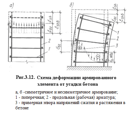 Начальные растягивающие напряжения в бетоне от усадки будут складываться с напряжениями в растянутой зоне изгибаемого элемента и способствовать более раннему появлению трещин в бетоне. Но с появлением трещин влияние усадки уменьшается, а в стадии разрушения исчезает и не оказывает влияние на предельную несущую способность элемента.