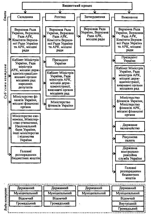 В Бюджетном кодексе Украины определены полномочия по осуществлению контроля бюджетного законодательства такими органами как Верховная рада Украины, Счетная палата, Министерство финансов, Государственное казначейство, Государственное контрольно-ревизионная служба, Верховная Рада и Рада министров АРК и соответствующими местными радами.