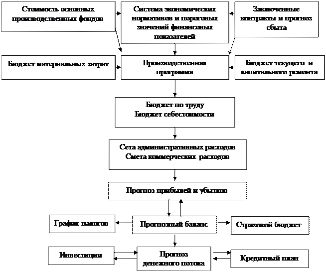 Система финансового планирования на предприятии включает: 1) систему бюджетного планирования деятельности структурных подразделений; 2) систему сводного (комплексного) бюджетного планирования деятельности предприятия. В целях организации бюджетного планирования деятельности структурных подразделений предприятия разрабатывается сквозная система бюджетов, объединяющая следующие функциональные бюджеты, охватывающие базу финансовых расчетов предприятия: