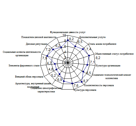 Имидж организации. Исследование имиджа ОАО «Автотеплотехник» путем анкетирования руководителей и специалистов организаций различных форм собственности, размеров и сфер деятельности, которое заключалось в оценке по десятибалльной шкале имиджевых составляющих организации, привело к следующим результатам (рис.1.):