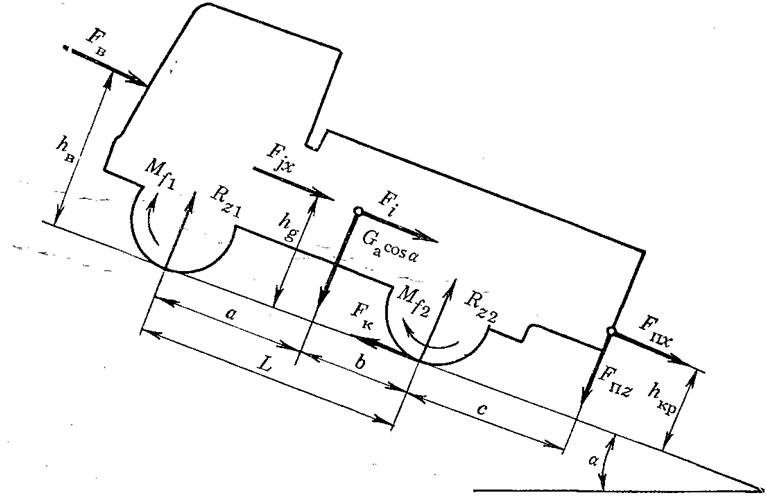 Рисунок 15 – Силы и моменты, действующие на автомобиль-тягач при прямолинейном движении