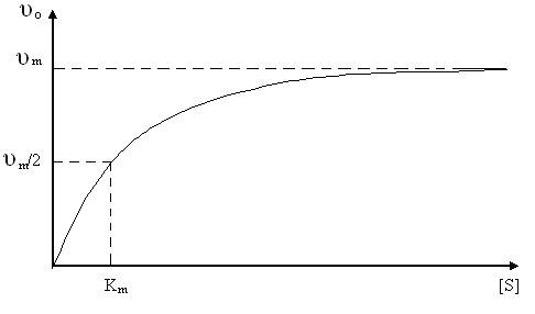 При изучении кинетики ферментативных процессов обычно измеряют начальные скорости реакции. Это достигается путем изменения только концентрации субстрата, тогда как все остальные условия опыта поддерживаются постоянными. Для реакций, в которых участвует несколько субстратов, должны также поддерживаться постоянными концентрации всех субстратов, кроме одного. Преимущество такого подхода состоит в том, что при этом не возникает осложнений, зависящих от подавления активности фермента продуктами реакции, изменением конформации фермента, рН среды и температуры, а также возможной обратимостью реакции. На рис. 1.1 показан график зависимости начальных скоростей от концентрации субстрата.