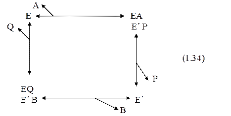 Бесконкурентное ингибирование можно описать с помощью схемы Боттса – Моралеса, если допустить, что образование формы EI не происходит вообще, а форму EIS рассматривать как «тупиковый» комплекс. Это означает, что центр, связывающий ингибитор, становится доступным для ингибитора только после того, как свяжется субстрат. В другом случае ингибитор может связываться с центром, который становится доступным после высвобождения одного из продуктов, как это имеет место для механизма, который называют механизм с замещением фермента (1.34):