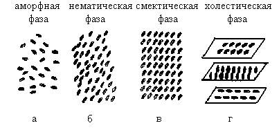Рис.4.4. Расположение молекул в аморфном (а), и жидкокристаллическом состоянии (б, в, г).