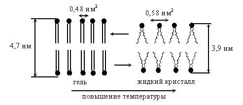 Толщина мембраны в гель-фазе больше, чем в жидком кристалле. Однако при переходе из твердого в жидкокристаллическое состояние объем несколько увеличивается, потому что возрастает площадь мембраны (в расчете на одну молекулу площадь возрастет с 0,48 до 0,58 нм2). Так как в твердокристаллическом состоянии упорядоченность в строении выше, чем в жидком кристалле, ему соответствует меньшая энтропия.