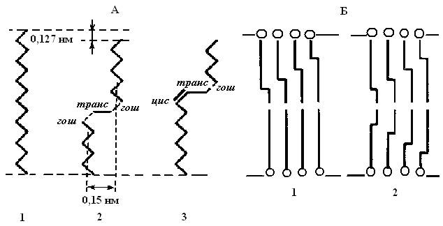 Рис.4.6. А: 1 - углеводородные цепи полностью в транс-конформации, 2 - в гош-транс-гош-конформации, 3 – в цис-транс-гош-конформации; Б: кинк-блоки в углеводородных цепях мембран: 1 - в одном монослое мембраны; 2 – в двух монослоях липидного бислоя.