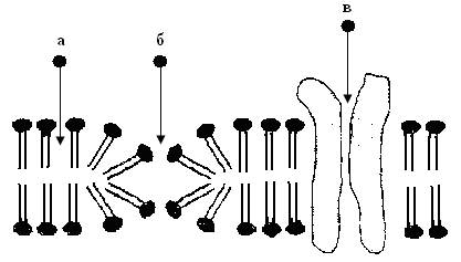 Рис.5.3.Основные разновидности простой диффузии через мембрану: а – через липидный бислой; б – через пору в липидном бислое; в – через белковую пору.