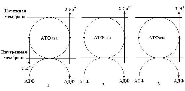 Рис.5.10.Виды ионных насосов: 1 – К+-Na+-АТФаза в цитоплазматических мембранах (К+-Na+- насос); 2 – Са2+-АТФаза (Са2+- насос); 3 – Н+-АТФаза в энергосопрягающих мембранах митохондрий и хлоропластов (Н+-насос).