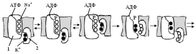 Рис.5.11.Рабочий цикл фермента К+-Na+-АТФазы (1 – большая субъединица фермента; 2 – малая субъединица; Р – фосфат.).