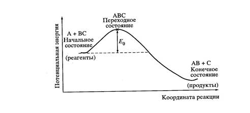 Разность Ео между энергиями начального состояния и активированного комплекса АВС представляет собой энергию активации элементарной реакции А + ВС. Координата реакции – наиболее выгодный путь протекания реакции, требующий наименьших энергетических затрат.