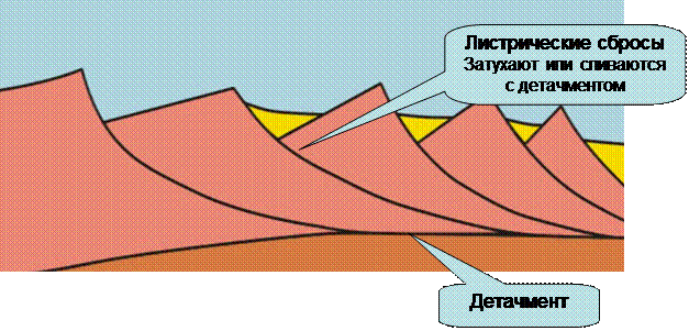 Верхняя и нижняя части коры разделяются субгоризонтальными поверхностями тектонических срывов – детачментов. Многие разрывные нарушения в рифтовых зонах выполаживаются на глубину, трансформируясь в листрические сбросы, и сливаются с детачментом (главным срывом).