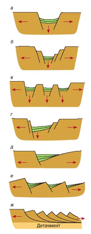 а - грабен; б - ступенчатый грабен; в - клавиатура блоков; г - асимметричный грабен; д - полуграбен; е - система из нескольких односторонне наклоненных блоков; ж - система из односторонне наклоненных блоков, относительно смещенных по листрическим сбросам и "опирающихся" на субгоризонтальную поверхность срыва растяжения (детачмент). В пределах рифтовых впадин показаны заполняющие их отложения