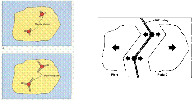 Важную роль могут иметь восходящие потоки горячего мантийного вещества – плюмы. Над ними формируются сводовые поднятия, в пределах которых происходит раскол и формирование крупных грабенов.