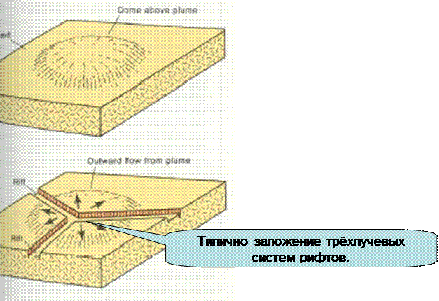 Сводо-вулканические рифтовые зоны обязаны своим происхождением мантийным плюмам – поднимающимся струям аномально нагретого глубинного материала.