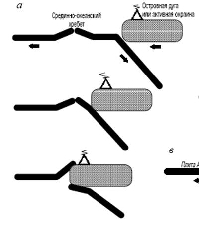Первый механизм возможен при столкновении активной континентальной окраины или островной дуги со срединно-океаническим хребтом, либо при столкновении энсиматической островной дуги с пассивной континентальной окраиной.