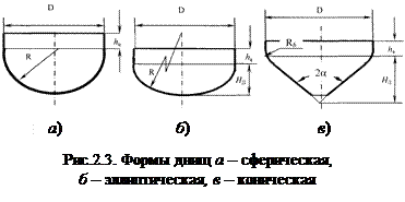 Наибольшее распространение в химическом машиностроении получили эллиптические, конические, сферические и плоские днища (рис.2.3). Днища ограничивают цилиндрические корпусы горизонтальных, так и вертикальных аппаратов с обеих сторон. Они могут быть приварные или отъемные. Форма днищ зависит от назначения аппарата и свойств перерабатываемого материала.