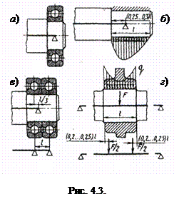 Валы обычно рассчитываются как балки на шарнирных опорах. Для коротких опор (подшипники качения, подшипники скольжения с отношением длины цапфы к ее диаметру l / d < 0,6) центр опорного подшипника совмещается с серединой подшипника (рис.4.3 а). При наличии длинных опор (l / d > 0,6) давление по длине подшипника вследствие деформации валов распределяется несимметрично. В этом случае считается, что опора расположена на расстоянии (0,25 ¸ 0,30) l от края подшипника со стороны нагруженного пролета (рис.4.3 б). При вращении вала в подшипниках качения, установленных по два в опоре, большая часть нагрузок воспринимается подшипником, расположенным со стороны нагруженного пролета, поэтому при создании расчетной схемы условные шарнирные опоры следует сместить от центра внутреннего подшипника на одну треть расстояния между подшипниками (рис.4.3 в).