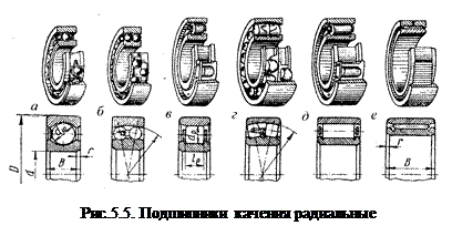 Шариковые радиальные однорядные подшипники (рис.5.5 а)предназначены для восприятия радиальных сил, но могут воспринимать и небольшие осевые нагрузки. Как и другие радиальные подшипники, они обеспечивают осевое фиксирование вала, удовлетворительно работают при перекосах колец на угол не более 8/.