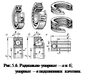 Шариковые радиально-упорные подшипники (рис.5.6 а)предназначены для восприятия совместно действующих радиальных и односторонних осевых нагрузок. Могут воспринимать чисто осевую нагрузку. Применяется преимущественно при средних и высоких скоростях. Подшипники с небольшим углом контакта (b=120) применяют в опорах с преобладающей радиальной нагрузкой. В опорах с превалирующей осевой нагрузкой устанавливают подшипники с повышенными углами контакта (b=26 и 360). Подшипники часто устанавливаются по два и более в опору, что обеспечивает большую грузоподъемность опоры, способность воспринимать двусторонние осевые нагрузки.