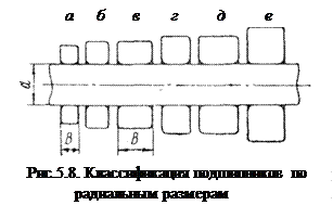 по габаритным размерам, связанными с нагрузочной способностью – на серии: сверхлегкие, особо легкие, легкие, средние и тяжелые, кроме того, по ширине – на узкие, нормальные, широкие и особо широкие. Примерное соотношение габаритных размеров подшипников, соответствующим сериям (при одинаковом внутреннем диаметре) – особо легкой (рис.5.8 а), легкой (рис.5.8 б), легкой широкой (рис.5.8 в), средней (рис.5.8 г), средней широкой (рис.5.8 д) и тяжелой (рис.5.8 е) показано на рис.5.8; наибольшее распространение получили средние и легкие серии подшипников;