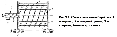 Смесевые барабаны. Смесевый барабан (рис.7.1) представляет собой цилиндрический корпус /, вращающийся на опорных роликах 2. Барабан снабжен внутренними спиральными ребрами 3 и полками 4 для лучшего перемешивания материала. Смесевый барабан является аппаратом периодического действия. Загрузка и выгрузка материала производится с помощью шнека 5.