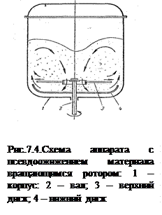 В корпусе 1 аппарата (рис.7.4)на консольном валу 2 быстро вращается ротор, состоящий из верхнего диска 3 (с центральным отверстием) и нижнего диска 4 (с загнутыми кверху краями). При вращении в аппарате создается интенсивная циркуляция сыпучего материала (направление циркуляции показано стрелками), который переходит в состояние, близкое к псевдоожижению. В промышленных аппаратах такого типа применяют различные конструкции быстровращающихся роторов.