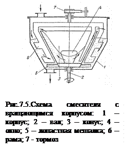 Процесс смешения осуществляется при подъеме материала по конусу вследствие разных скоростей его частиц, а также в пространстве между конусом и корпусом при падении частиц и при перемешивании их лопастной мешалкой. Для материалов с плохой сыпучестью в корпусе устанавливают раму 6; последняя движущимся материалом вовлекается в свободное вращение, скорость которого регулируют ленточным тормозом 7. Рама 6создает дополнительные завихрения в движущемся материале, что способствует лучшему его смешению. Загрузка и разгрузка материала производится через люки соответственно в крышке и днище корпуса.