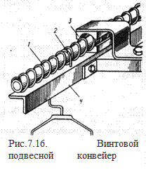 Подвесные винтовые конвейеры (рис.7.16) относятся к устройствам непрерывного транспорта без тягового элемента. Они применяются для транспортировки легких грузов в подвешенном состоянии (швейные изделия, коробки). Винтовые подвесные конвейеры просты по устройству и надежны в работе. Трасса конвейера может быть прямолинейной горизонтальной или наклонной, а также может включать участки горизонтальных поворотов. Скорость винтовых конвейеров не превышает v = 0,2 м/с, масса груза на подвеске не превышает mrp = = 2... 3 кг.
