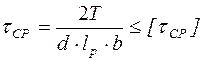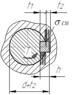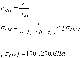 Наиболее частый вид отказа шпоночного соединения – разрабатывание (появление люфта вследствие смятия шпонки). Поэтому расчет шпоночных соединений чаще всего ведется по напряжениям смятия: