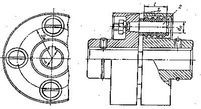 В качестве примера упругой компенсирующей муфты рассмотрим муфту упругую втулочно-пальцевую (МУВП). МУВП состоит из двух полумуфт 1, соединенных пальцами 2, на которые для смягчения ударов надеты гофрированные резиновые втулки 3. Такие муфты в силу простоты конструкции получили широкое применение в приводах от электродвигателей. Для валов с диаметрами 9…160 муфты стандартизированы (ГОСТ 21424-75).