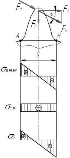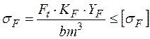 , создаваемых окружной (тангенциальной) силой Ft, возможен усталостный излом зубьев. Для обеспечения усталостной прочности зубьев при изгибе должно выполняться неравенство: