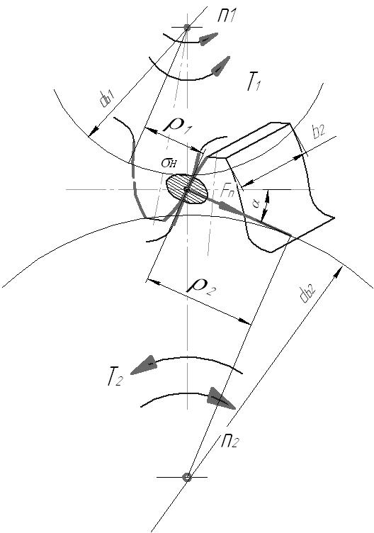 Расчет на контактную прочность проводят для зубчатого колеса, т.к. его материал, как правило, менее прочный, чем у шестерни.