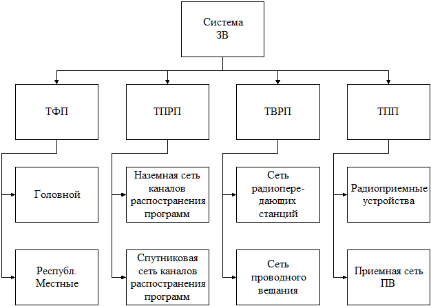 Электрический КЗВ или система ЗВ состоит из следующих функциональных частей (Рис.1) – трактов: формирования программ; первичного и вторичного распределения программ; приема программ.